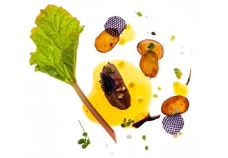 Arrange 4 large slices of meat and 6½ baby potatoes along with the diced rhubarb on a plate