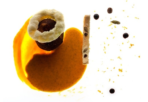 Poached Egg, Butternut Arpeggio Cappuccino and Onion Rings