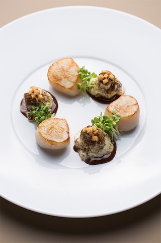 Sauté the scallops in a non-stick pan with crushed garlic, a sprig of thyme, half a laurel leaf and