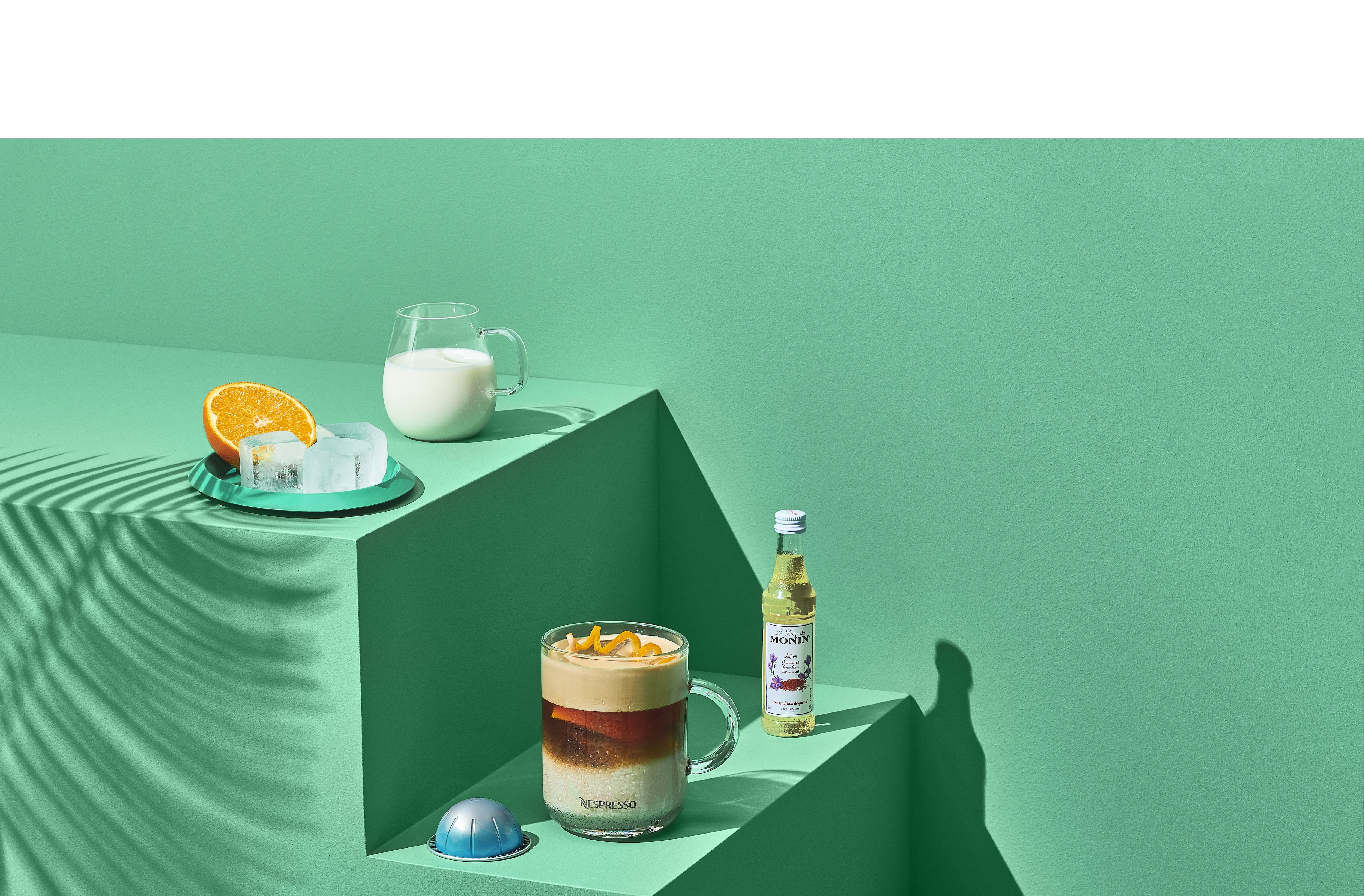 Colocar 4 cubos de hielo (30 g cada uno), 10 ml de jarabe de azafrán, una cáscara de naranja fresca y 120 ml de leche en una taza Vertuo Mug
