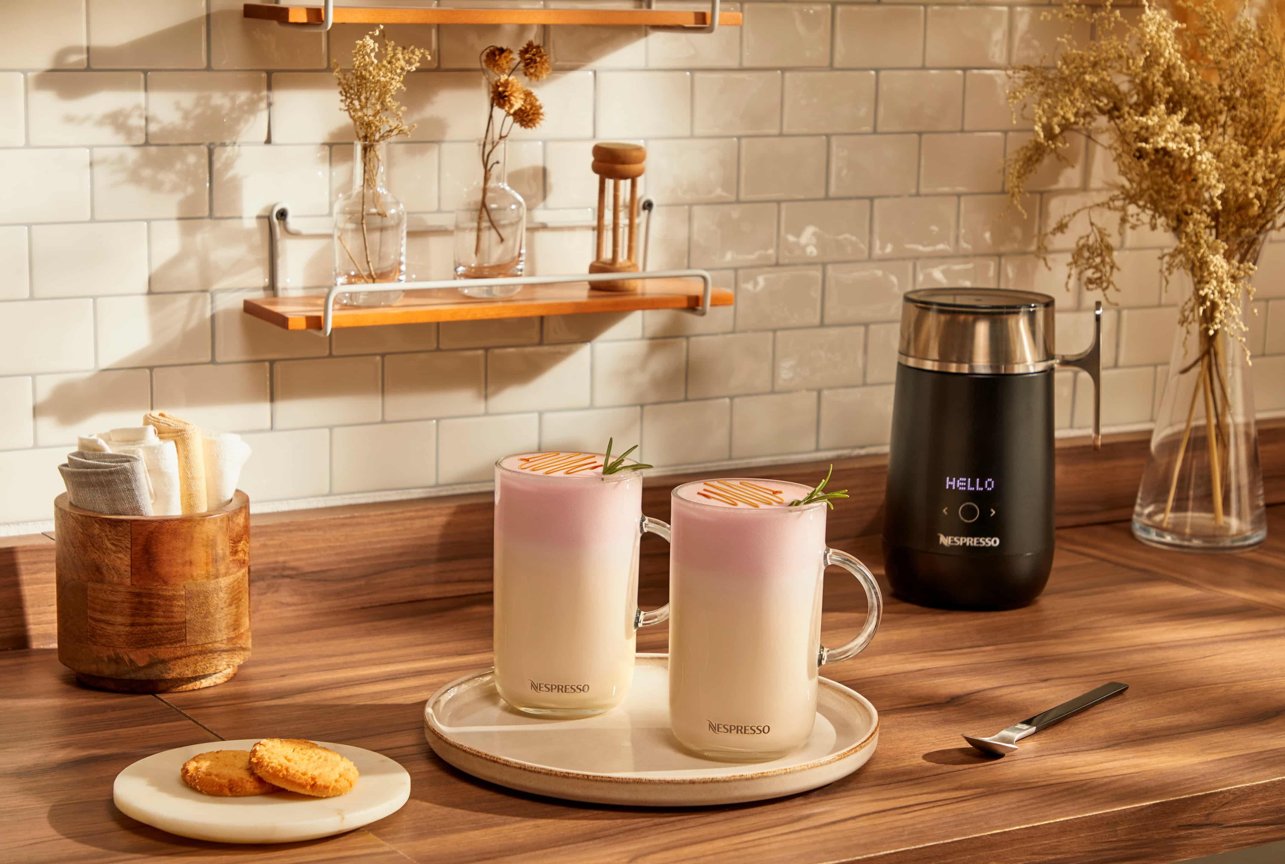 Espuma la leche de fresa en el Aeroccino (opción frío) o en el Barista usando la receta "Café Vienés". Sírvela en el vaso sobre la preparación anterior.