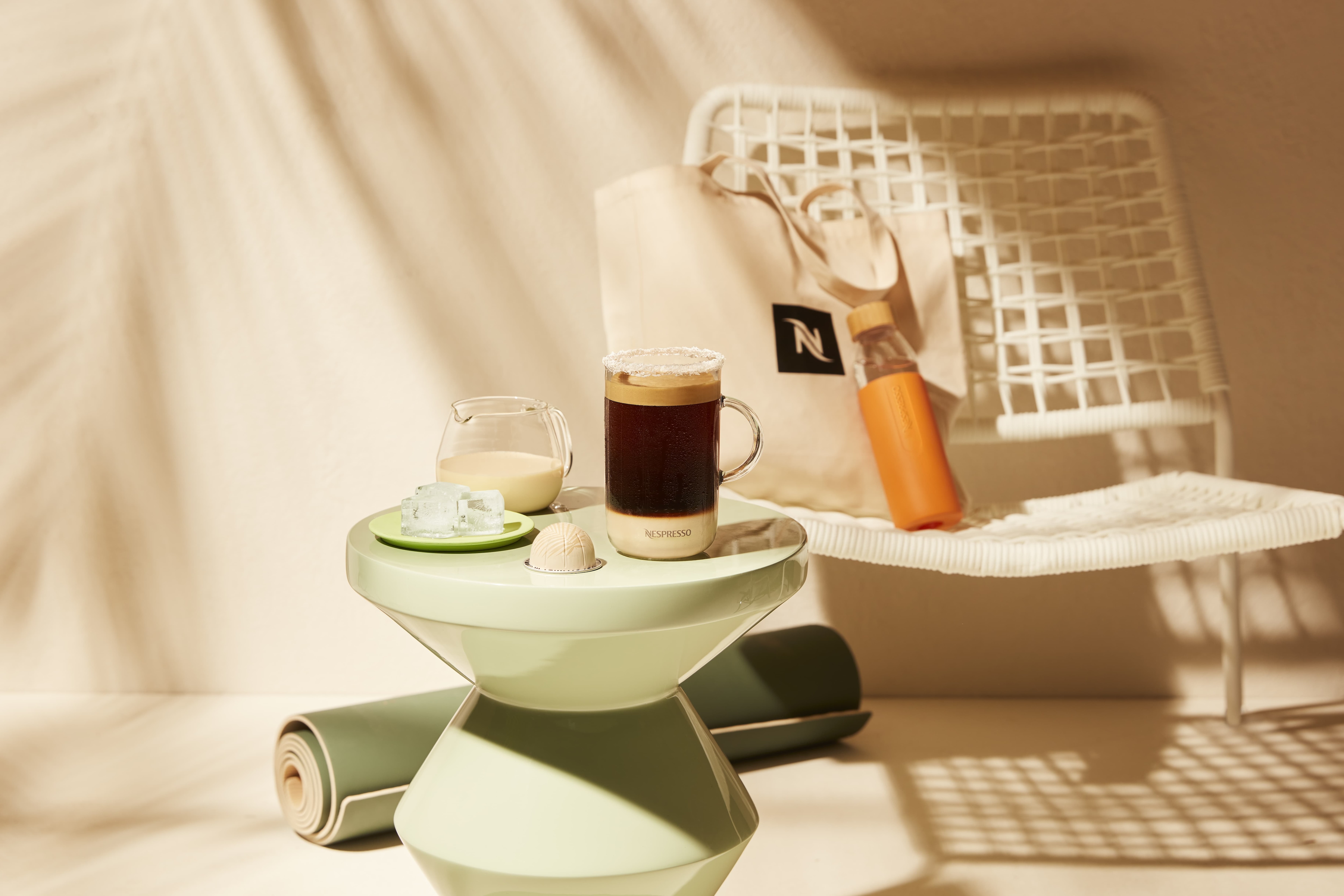 Coloca 7 cubos de hielo (30 g cada uno) en tu Taza Alto Mug. Vierte (20ml) de Jarabe de Piña y 80ml de leche de avena.