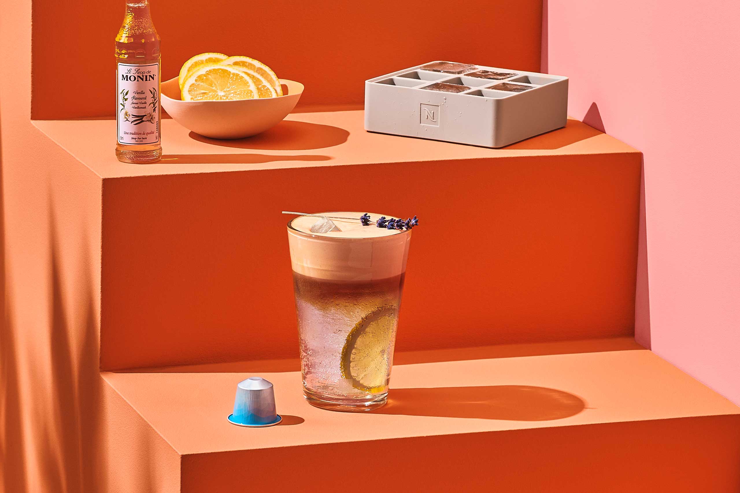 Brew a capsule of BARISTA CREATIONS FREDDO DELICATO over 1 tsp of fresh or dried lavender, in a VIEW Recipe glass.