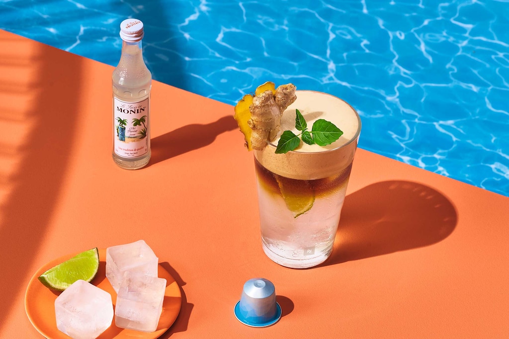 a) by hand: Let it infuse for 2 minutes before straining it into a shaker and adding one ice cube. Seal the shaker and shake vigorously. b) with the Nespresso Barista device: Strain it into your Nespresso Barista jug, add 1 ice cube, close the lid, select the “Iced Nitro” recipe and press the start button.