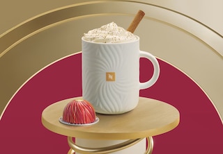 Do świątecznego kubka wlej 10 ml syropu daktylowego i zaparz 80 ml kawy Cinnamon & Tamarind Vertuo (w trybie Double Click Recipe: poprzez dwukrotne naciśnięcie przycisku kawy).