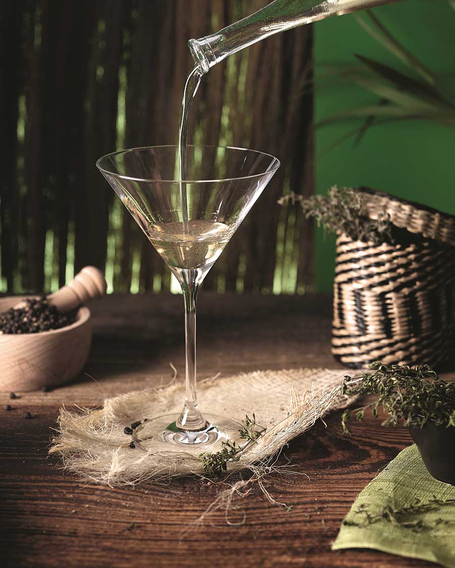 將些許預先搗碎的乾燥百里香葉、葡萄柚汁及 2 顆冰塊置於手搖杯中,將其均勻搖晃數秒後,倒入於玻璃杯中