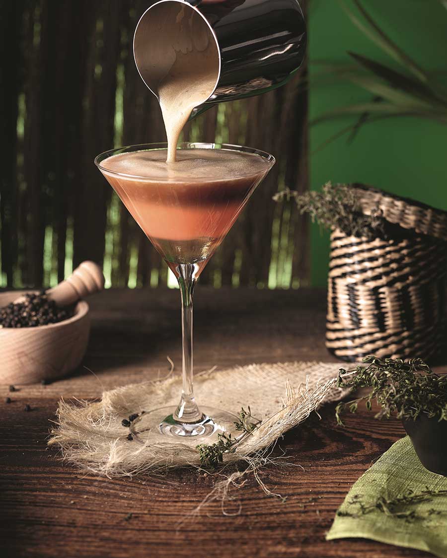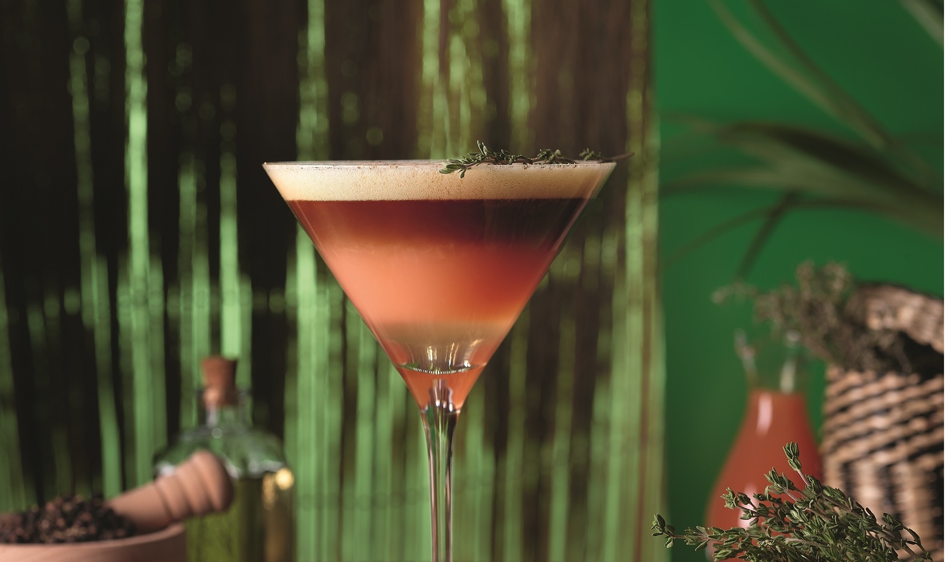將咖啡倒入玻璃杯並以乾燥百里香葉裝飾後即可上桌