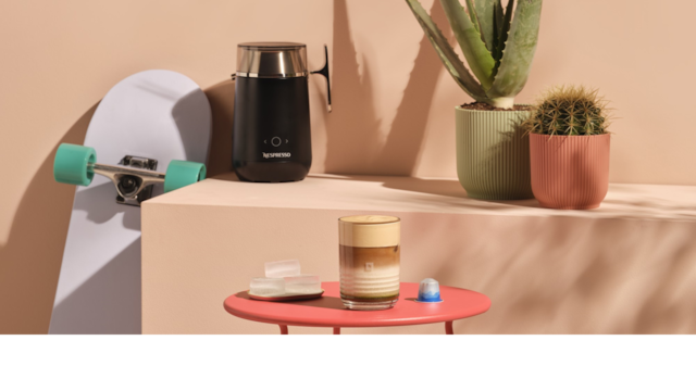 將Nespresso Barista咖啡大師調理機製作好的氮氣冰咖啡倒入杯中
