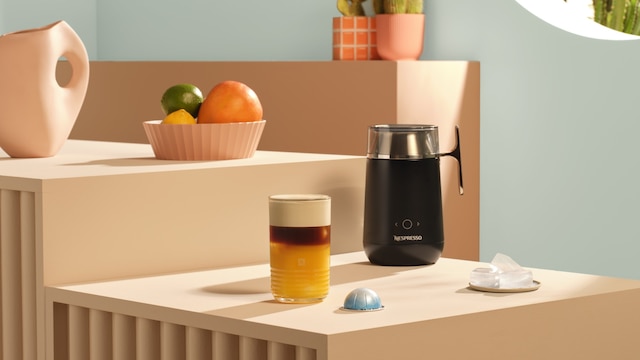 將Nespresso Barista咖啡大師調理機製作好的氮氣冰咖啡倒入Barista特調咖啡杯中