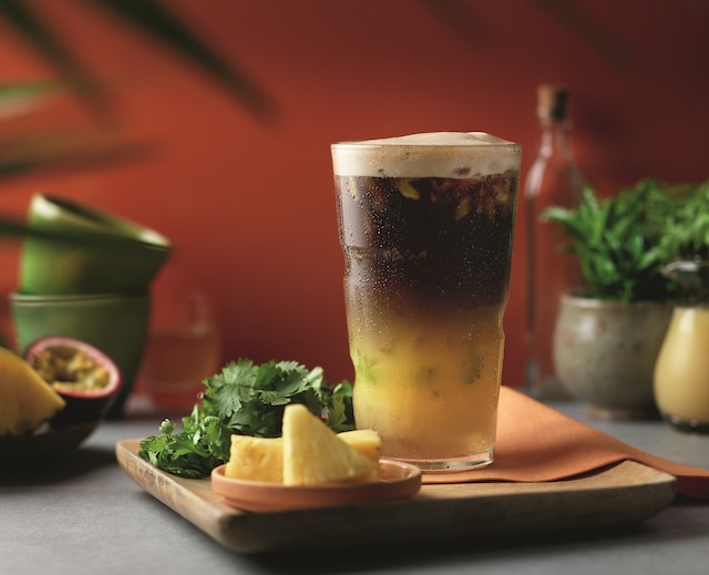 Halve the passion fruit, scoop out the seeds and flesh and add to the glass