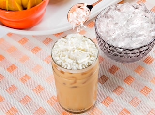 2 capsules of Voltesso or 1 capsule of Linizio Lungo, brewed and cooled 1 oz. coconut syrup ½ oz. mango syrup, or 3 Tbs. mango nectar 6 oz. milk Ice Whipped cream Coconut shavings (garnish)