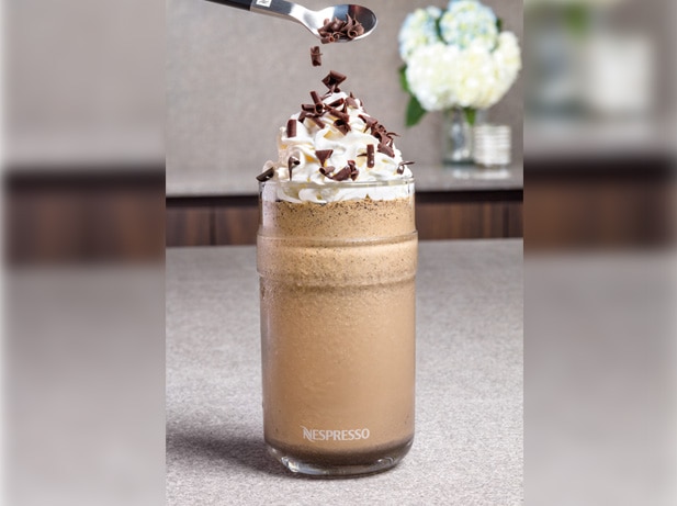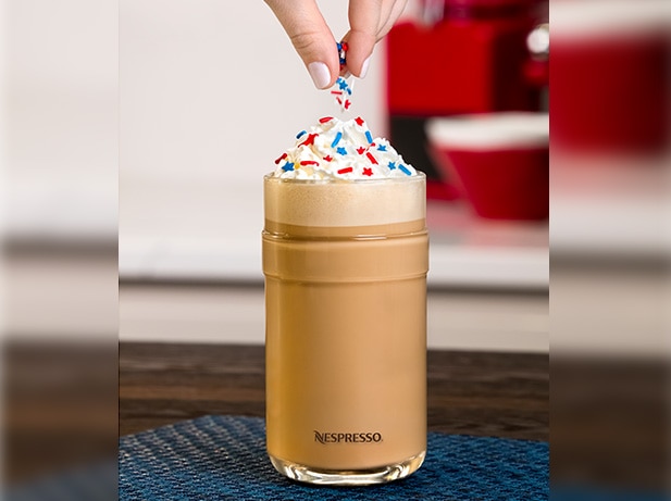2 capsules of Diavolitto or Kazaar, brewed and cooled 2–3 scoops vanilla ice cream 1 oz. cupcake-flavored (or cake-flavored) syrup 4 oz. cold milk Whipped cream Red, white & blue sprinkles (garnish)