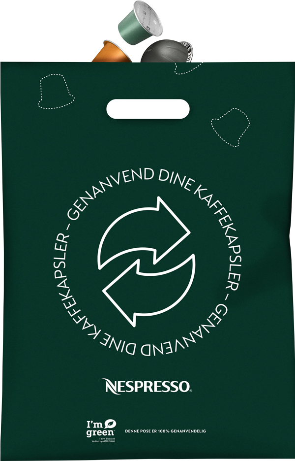 Ved bestilling af kaffekapsler vil det tilsvarende antal genanvendelsesposer blive foreslået, så du kan tilføje dem til din kurv. Du kan også bestille her og tilføje en pose til din ordre. Hvis ikke du bestiller dine kaffekapsler online, kan du altid hente en gratis genanvendelsespose i vores Nespresso Boutiques.