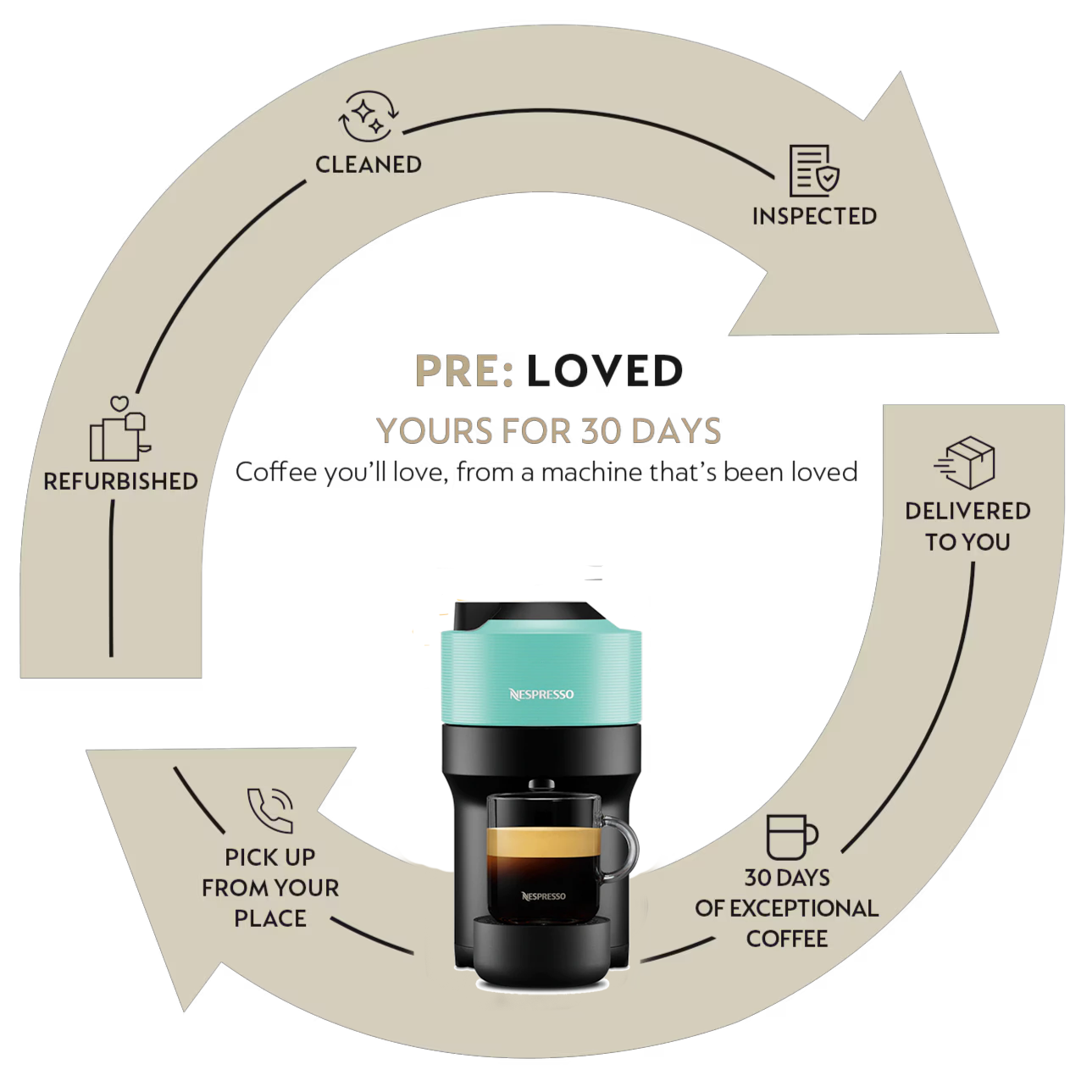 *All trial machines under this program are PRE:LOVED Nespresso machines that have been refurbished, carefully inspected, cleaned, and repaired.