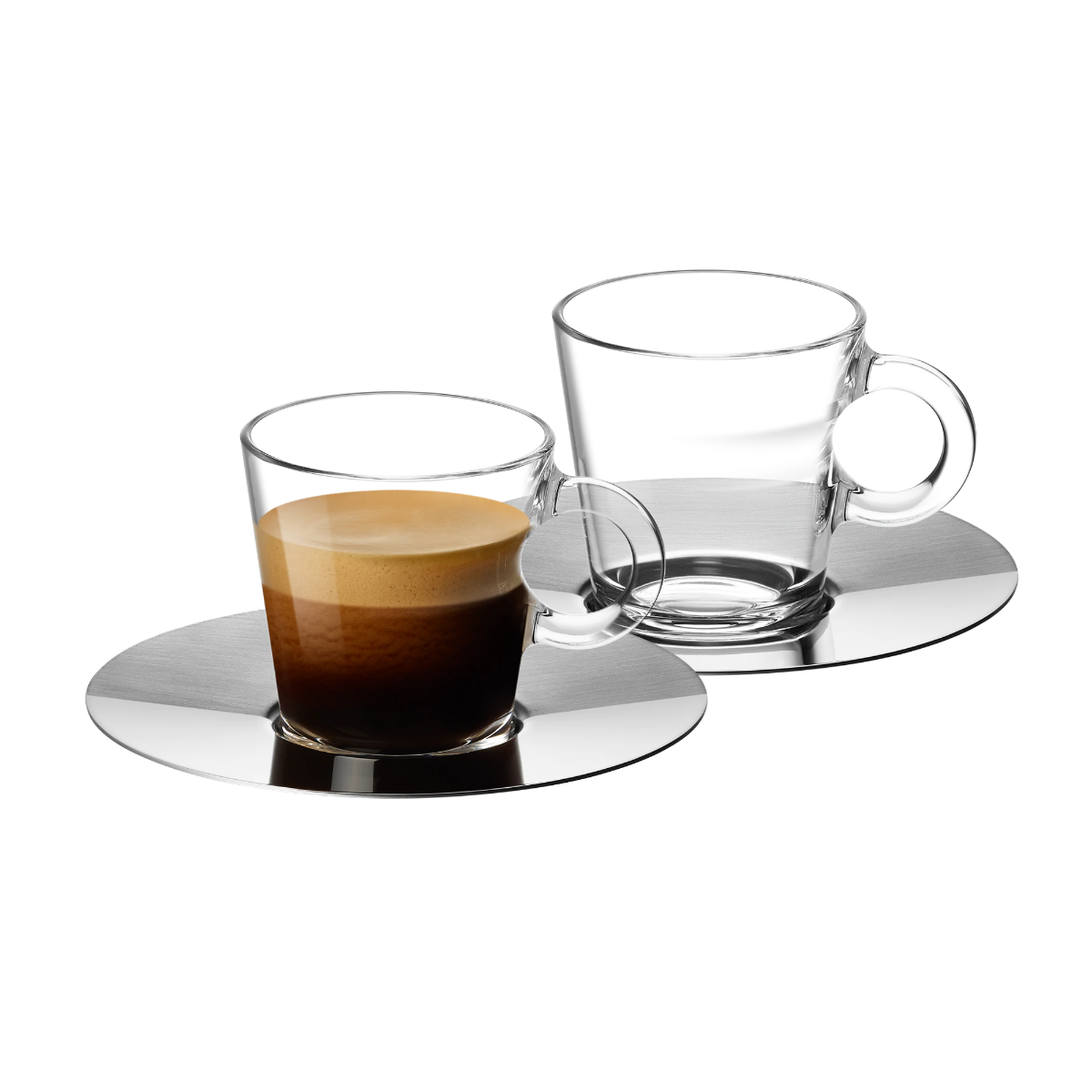 description Set of 2 Espresso tempered glass cups and black and charcoal grey melamine saucers.