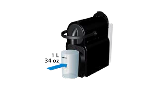 - Fill the water tank with 0.5 L of potable water and add 1 Nespresso descaling liquid sachet.