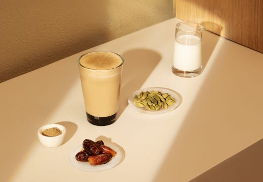 Date & Cardamom Creamy LatteÉpais et crémeux ! Cette recette de café est un mélange parfait pour la saison du Ramadan. Sucré avec des dattes, il est incroyablement savoureux. -