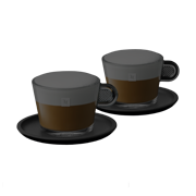 Set of 2 Espresso tempered glass cups and charcoal grey melamine saucers.