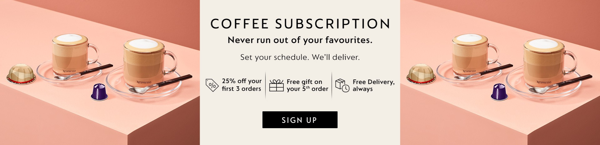 By setting up a Coffee Subscription, not only do you ensure that you never run out of your favourite Nespresso coffees, you also get Free delivery and to save you time and effort on placing an order when you need it. You can set up, modify or cancel your Recurring Order on the Nespresso website